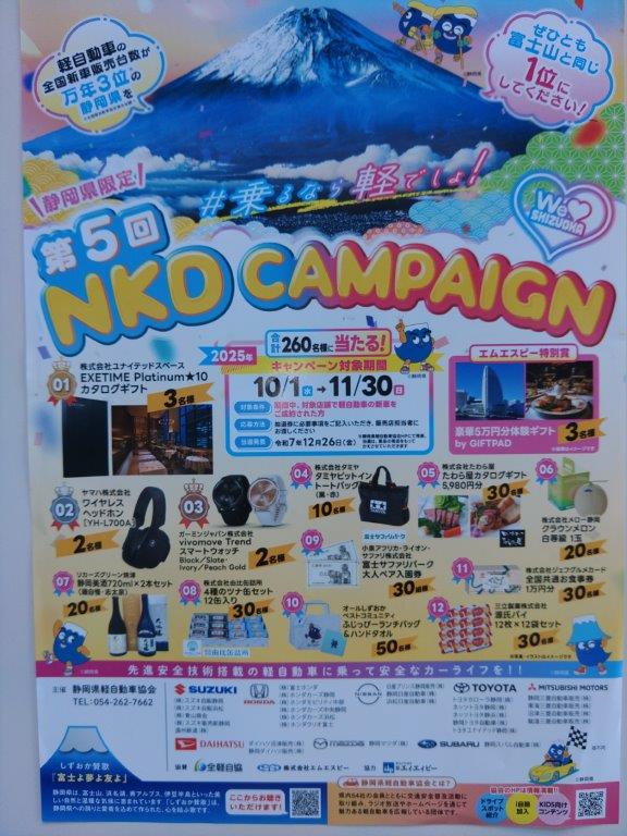 乗るなら軽でしょ! 新車 | 2025.10.03 今年も「乗るなら軽でしょ!」(NKD) キャンペーンが開催されます ヾ(o´∀`o)ノ ただいま新車の軽自動車をご購入された方から抽選で、 豪華景品があたる、、、かも。 キャンペーン期間は10月1日から11月30日までとなります。 新車のご購入をご検討されている方いましたら落合自動車販売㈱まで。 皆さまのご来場お待ちしております m(_ _)m