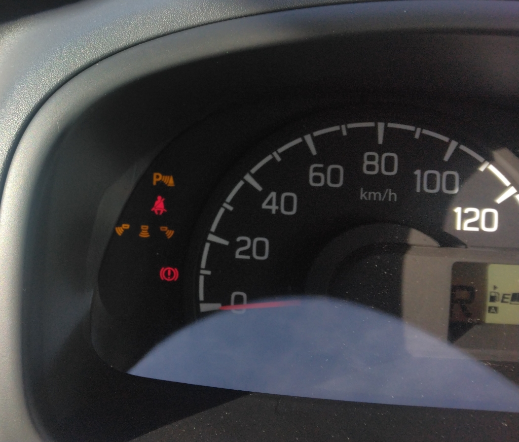 表示でも ヾ(o´∀`o)ノ 中古車 | 2025.11.07 本日の画像はキャリイトラックのメーター。 バックをしているところですが、後方のブロック塀に反応して 「 ピーピーピー 」とブザーが鳴っています。 と同時にメータ内には反応している位置を表示します。 Pのマーク点滅で作動していることをお知らせしてシートベルト警告灯下の センサーマークで後方か後部左右か点灯します。 今回は壁の近くなので3方向すべてが点灯です。 後方は死角となるところもあります。 安全装備が付いていると駐車なども安心してできる、、、ハズ ヾ(o´∀`o)ノ 安全装備が付いた展示車両がたくさんございます。 ぜひご覧になってください m(_ _)m
